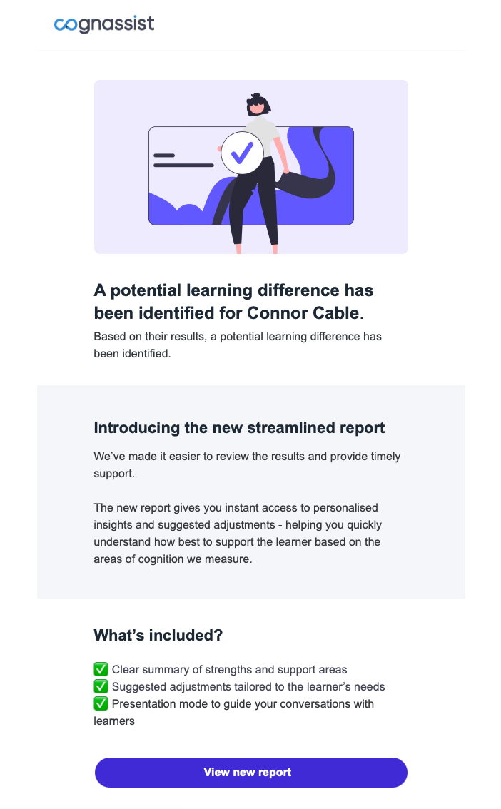 - If a tutor tries to view the Tutor Report for a learner who previously completed the assessment, they’ll receive an email once the report is ready. Cognassist generates the report on request, so there may be a short delay.