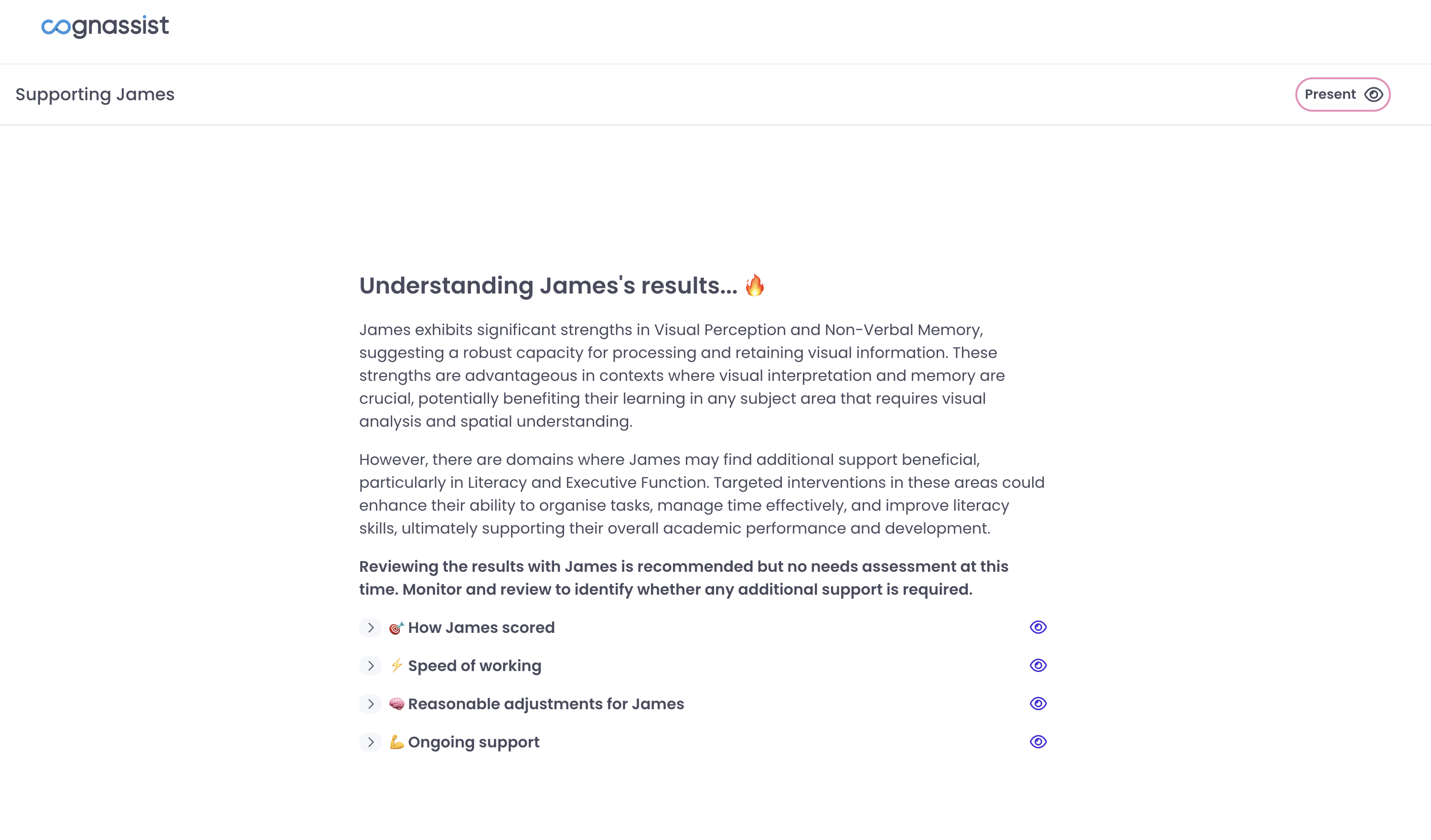 - Presentation Mode is designed for tutors to use when sharing assessment results with learners. It respects any sections the tutor has chosen to hide and presents the report in a learner-friendly format - using strengths-led language and positive framing to translate the tutor’s view into something meaningful and encouraging for the learner.