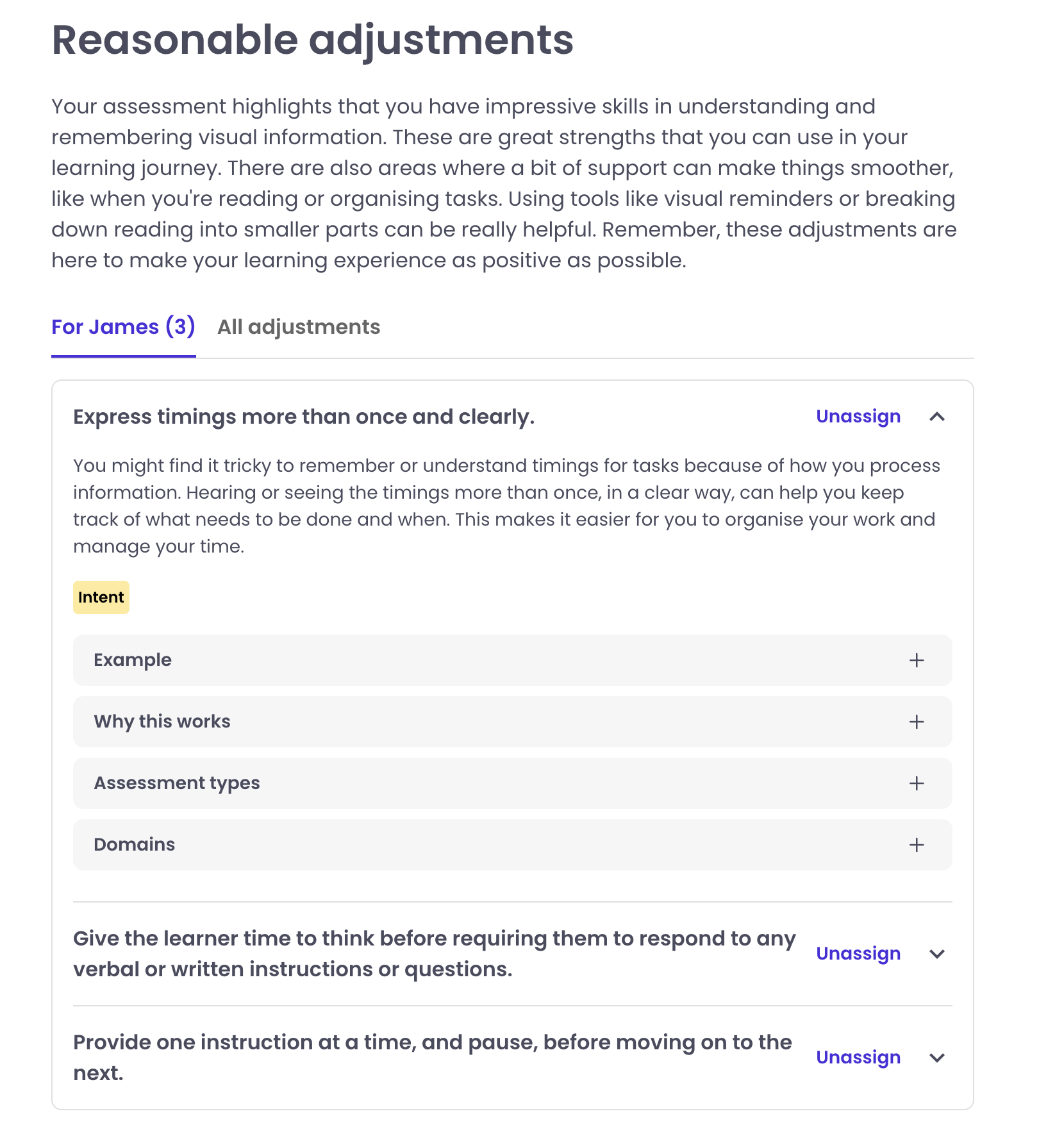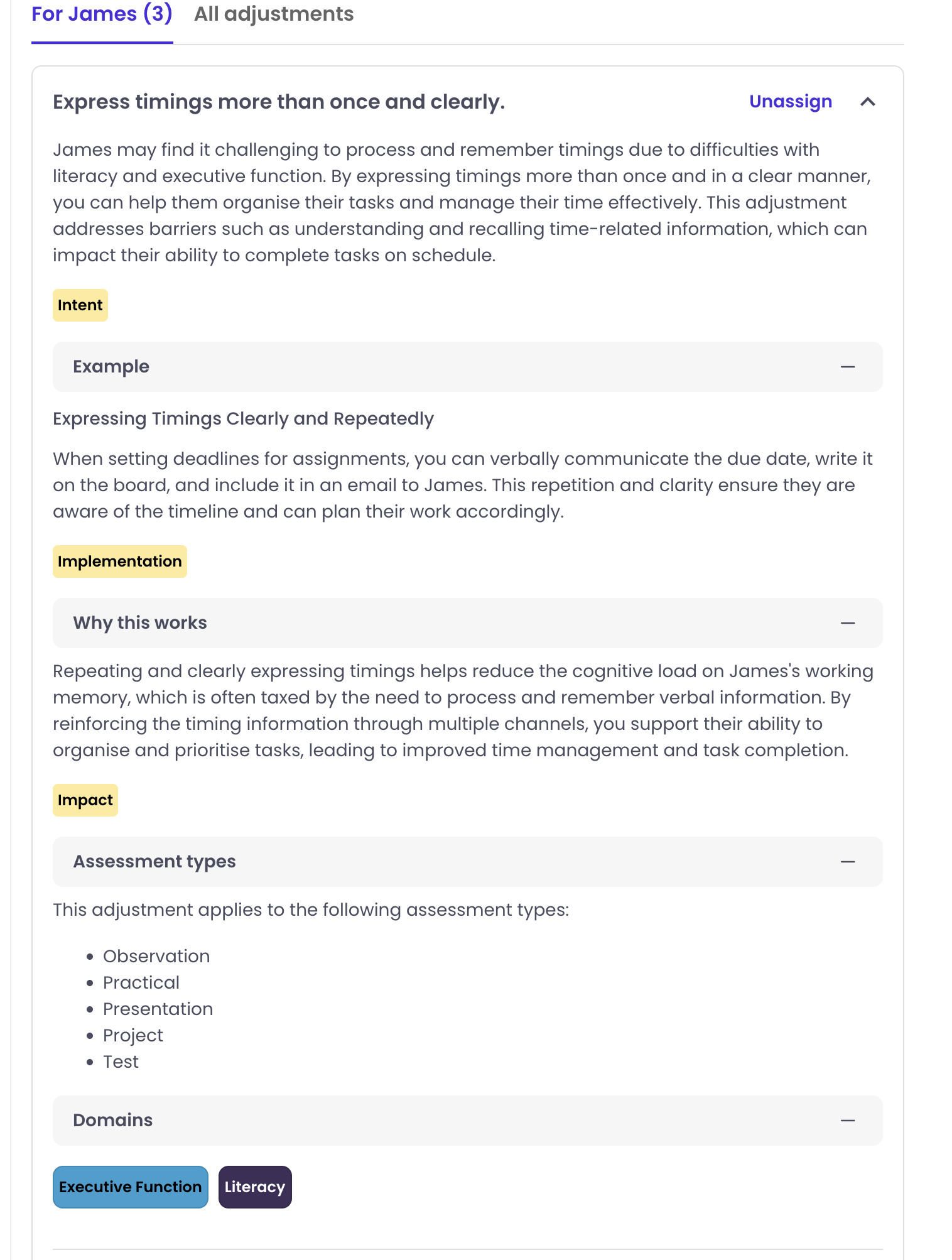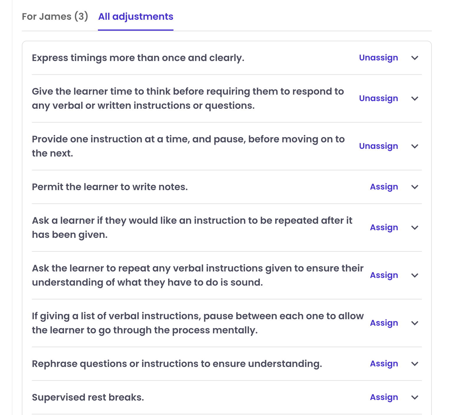 - The tutor also has access to all the other adjustments applicable to the Learner and has the option to swap out the currently assigned adjustments using the 'all adjustments' tab and the assign/unassign button for each adjustment.