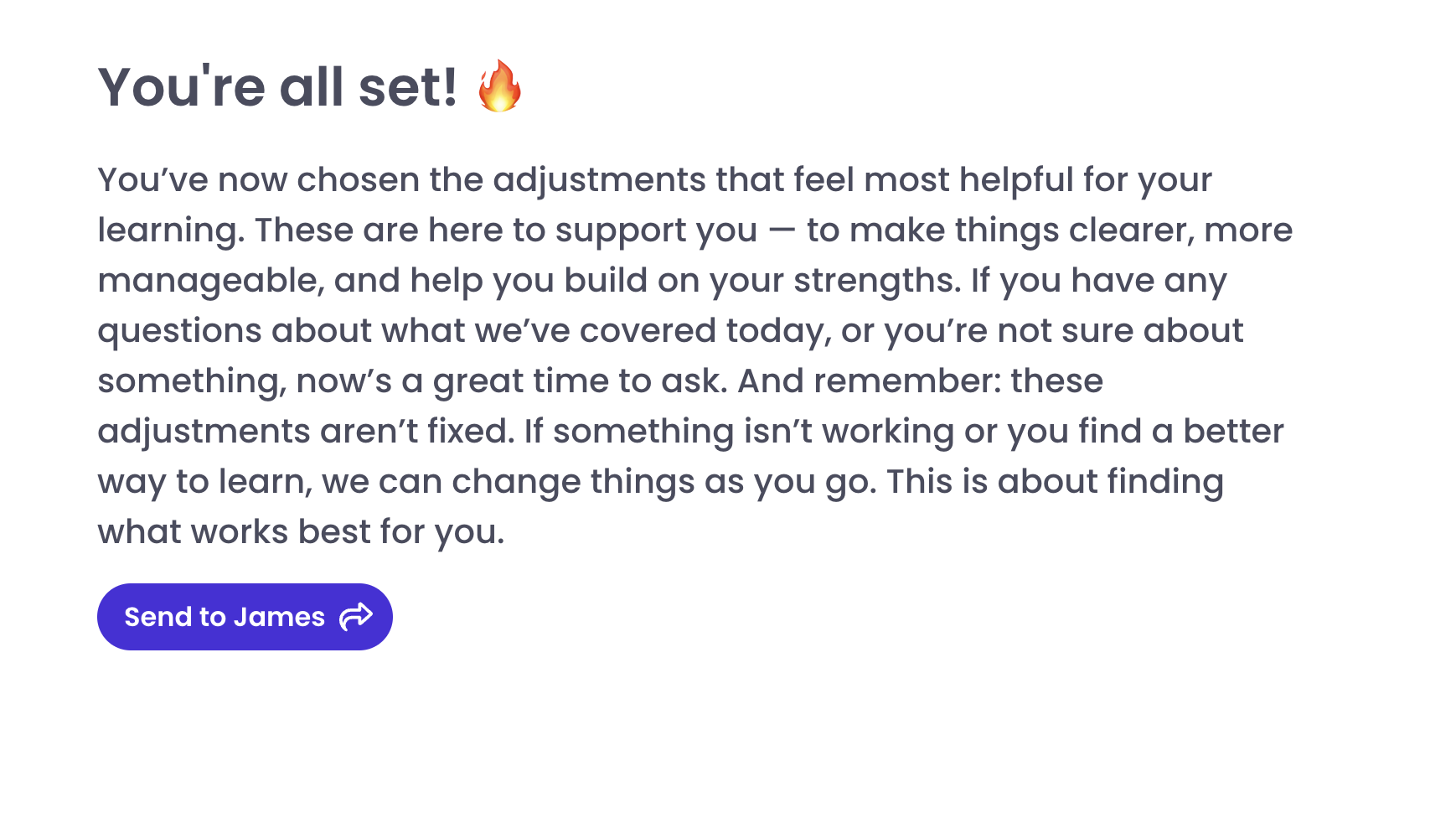 - For learners where a potential learning difference is identified, there will be a newly revamped reasonable adjustments section. Each adjustment now contains a description, an example, and why this works for the learner, aligned to Ofsted’s 3 I’s (Intent, Implementation, Impact)