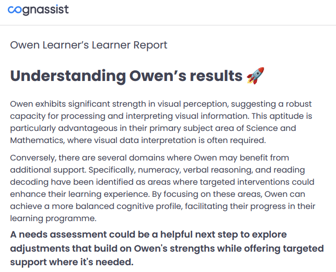 The tutor report will be available for all learners who have taken V2 of the Cognassist assessment